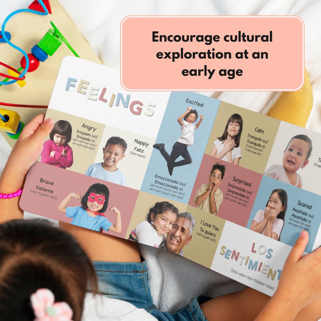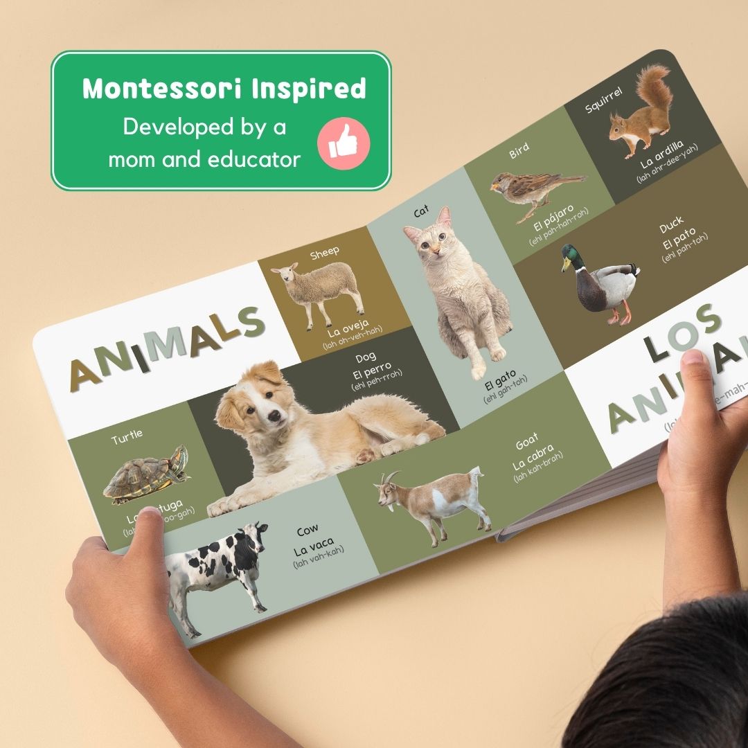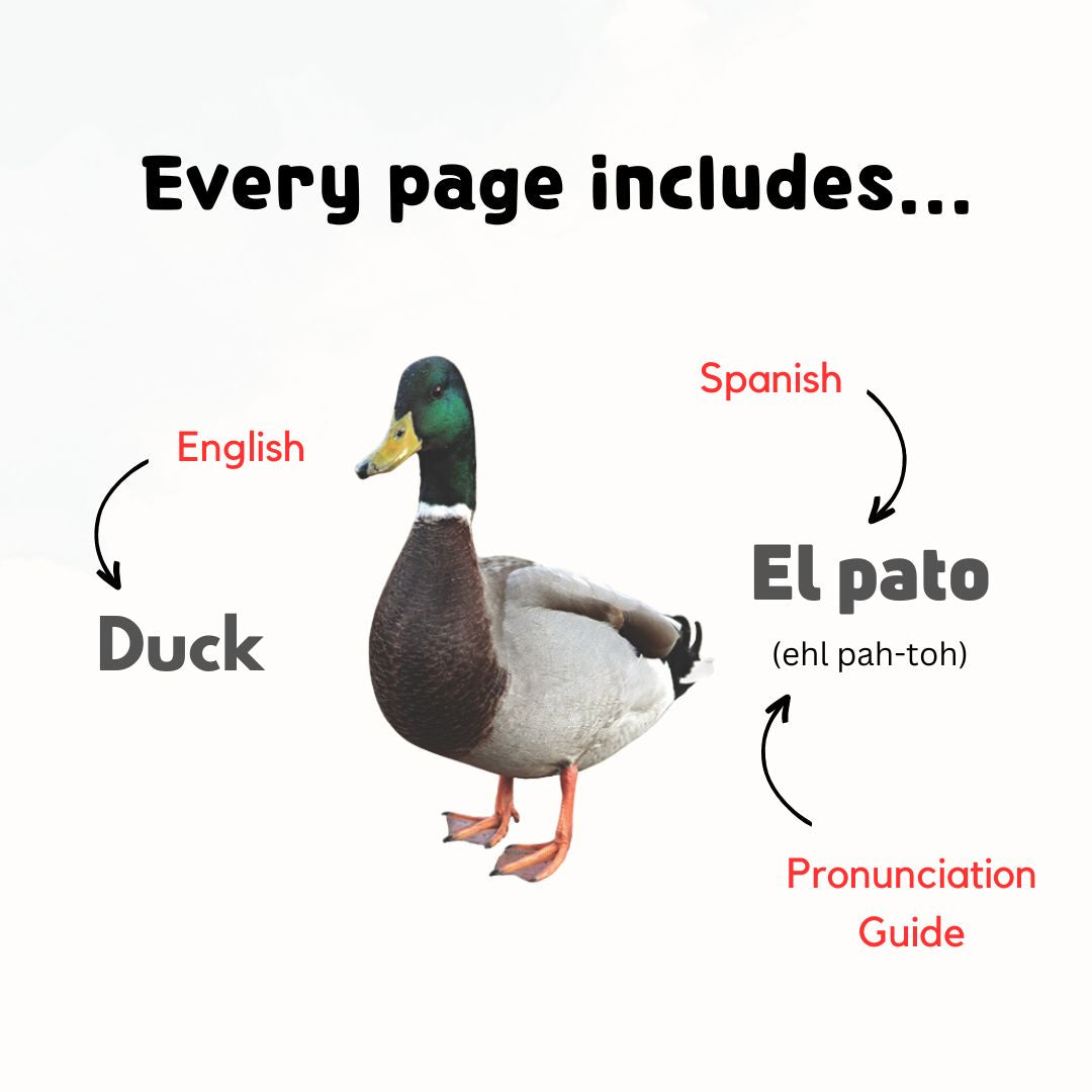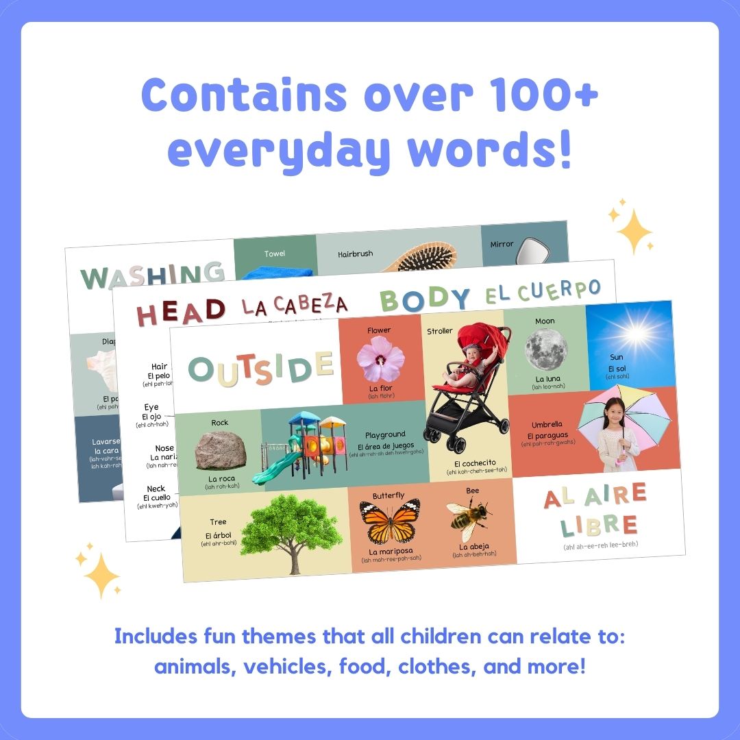 - Explore over 100 words written in Spanish, English, with a pronunciation guide, making language learning fun and interactive for your children