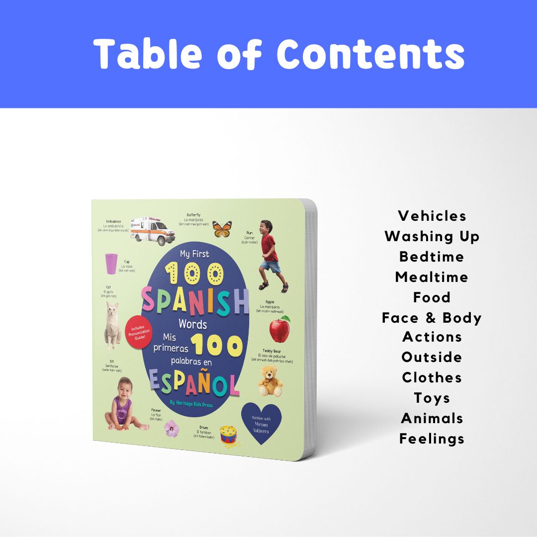 Look no further! My First 100 Spanish Words is a bilingual board book written in Spanish, English, with a pronunciation guide, providing families with a beautiful presentation of over 100 words that children can enjoy from their baby years and beyond.