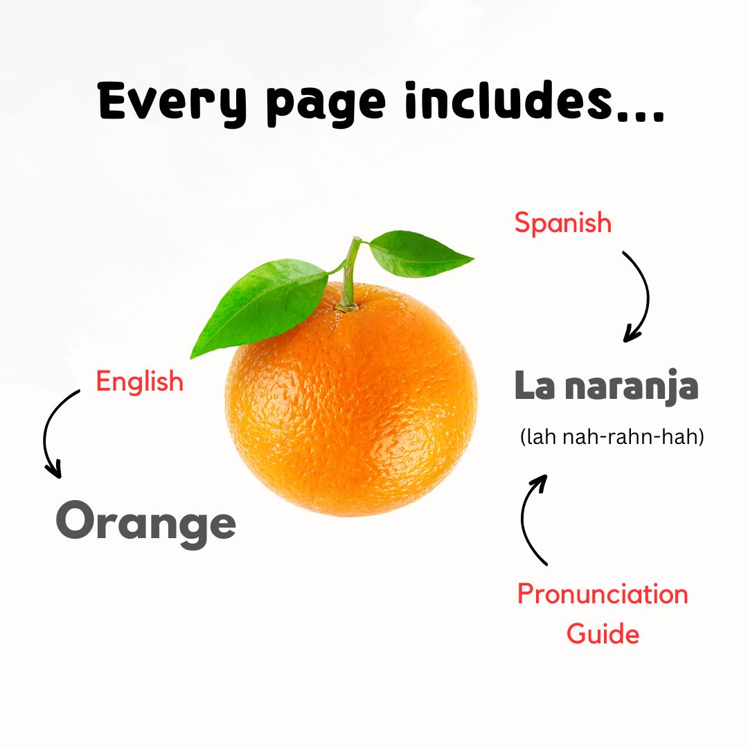 - Over 100 words with English, Spanish, including a pronunciation guide