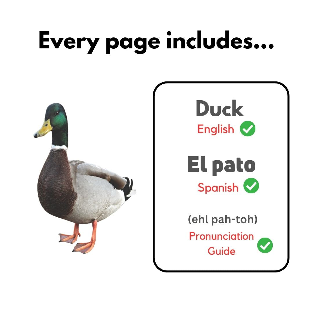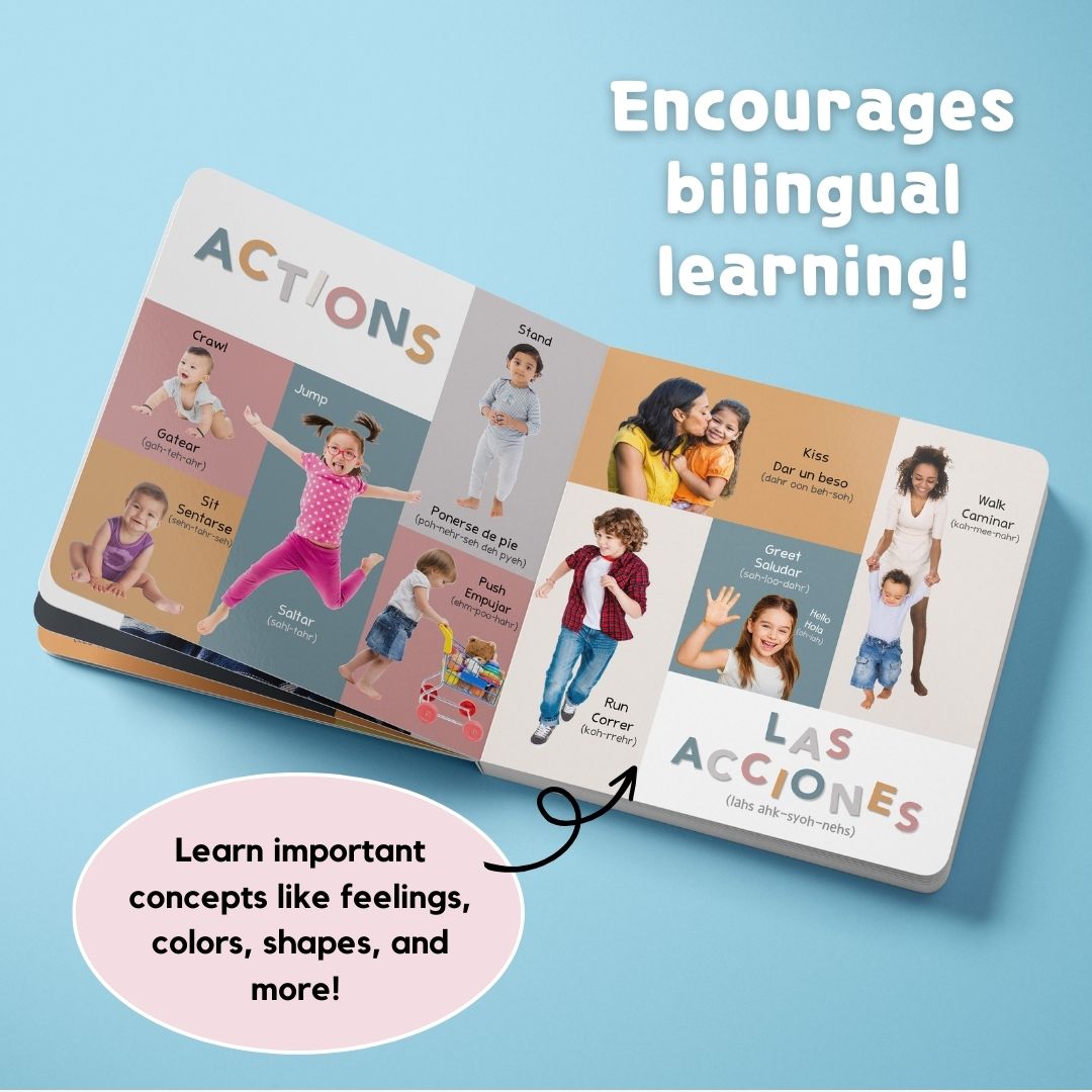 This adorable set of children’s bilingual books is perfect for tiny tots aged 0-3 years and their families who want to learn Spanish. Babies love real photos because they can recognize and connect with the world around them—which is why our books are packed with bright and beautiful photographs that are sure to engage your child’s senses!