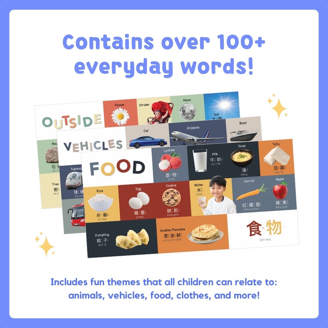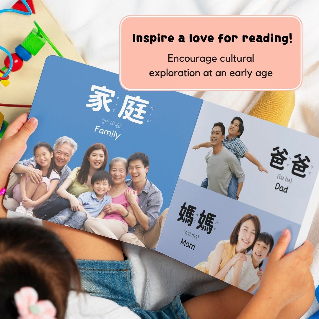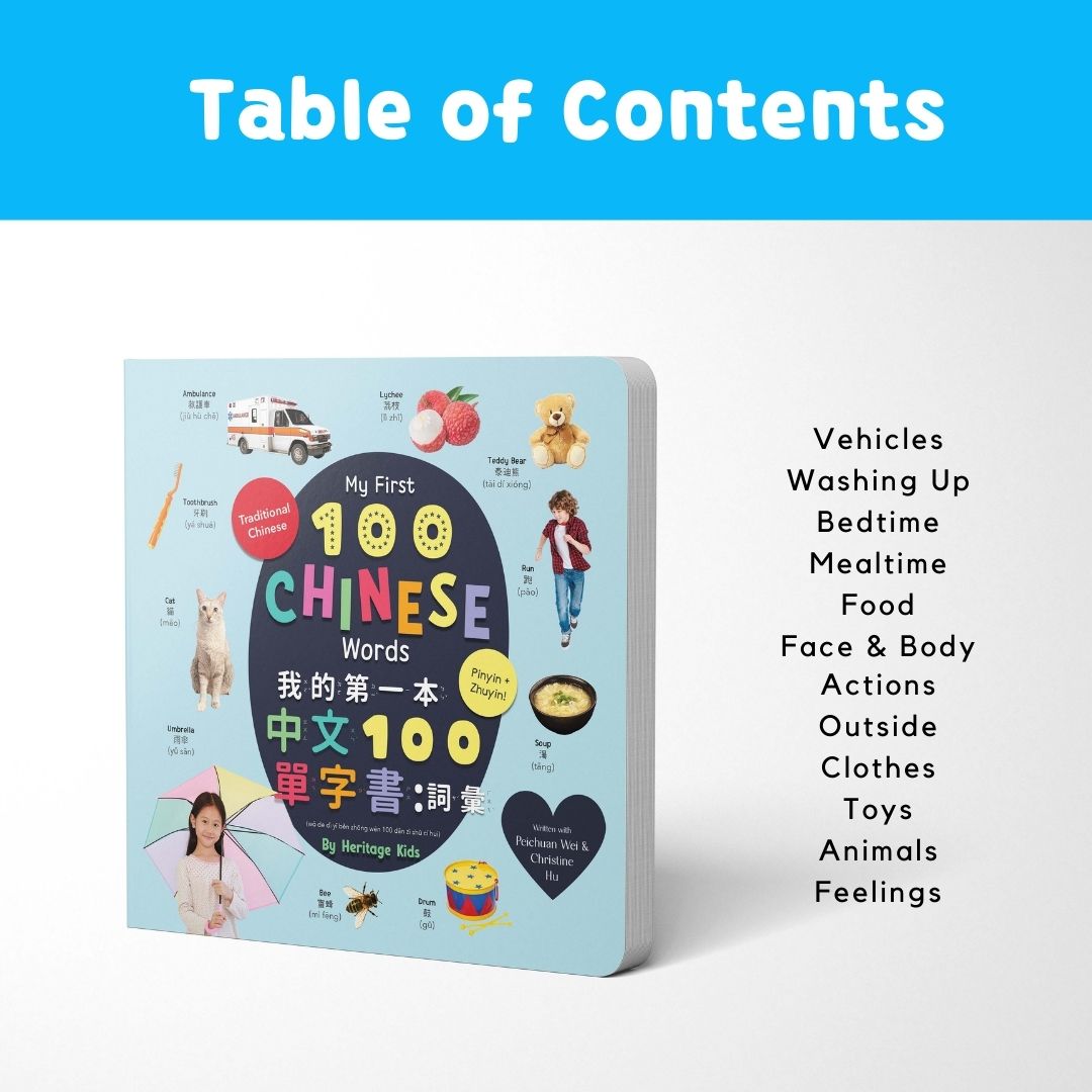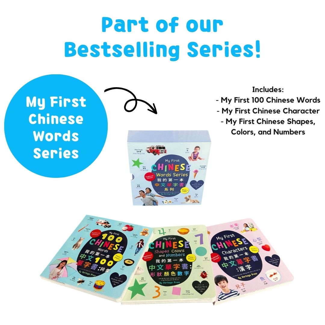 Look no further! My First 100 Chinese Words (我的前一百个中文词) is a bilingual board book written in Traditional Chinese, English, Pinyin, and Zhuyin, providing families with a beautiful presentation of over 100 words that children can enjoy from their baby years and beyond.