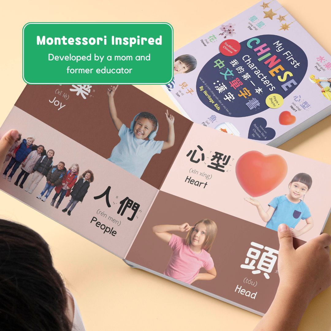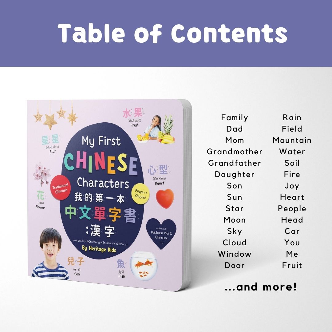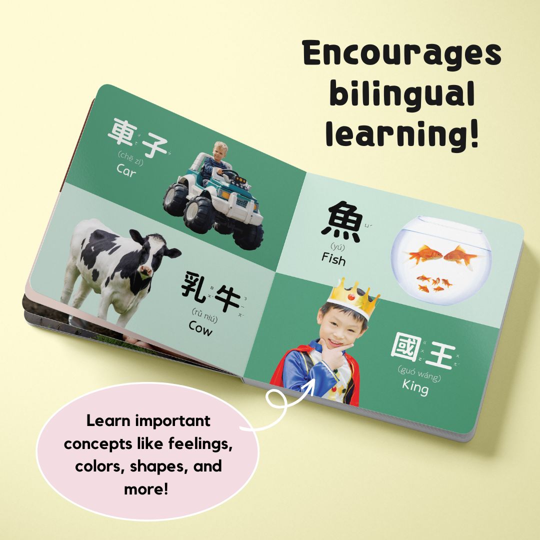 Look no further! My First Chinese Characters (我的第一本 中文书:汊字) is a bilingual board book written in Traditional Chinese, English, Zhuyin, and Pinyin, providing families with a beautiful presentation of high frequency Chinese characters to learn with kids.