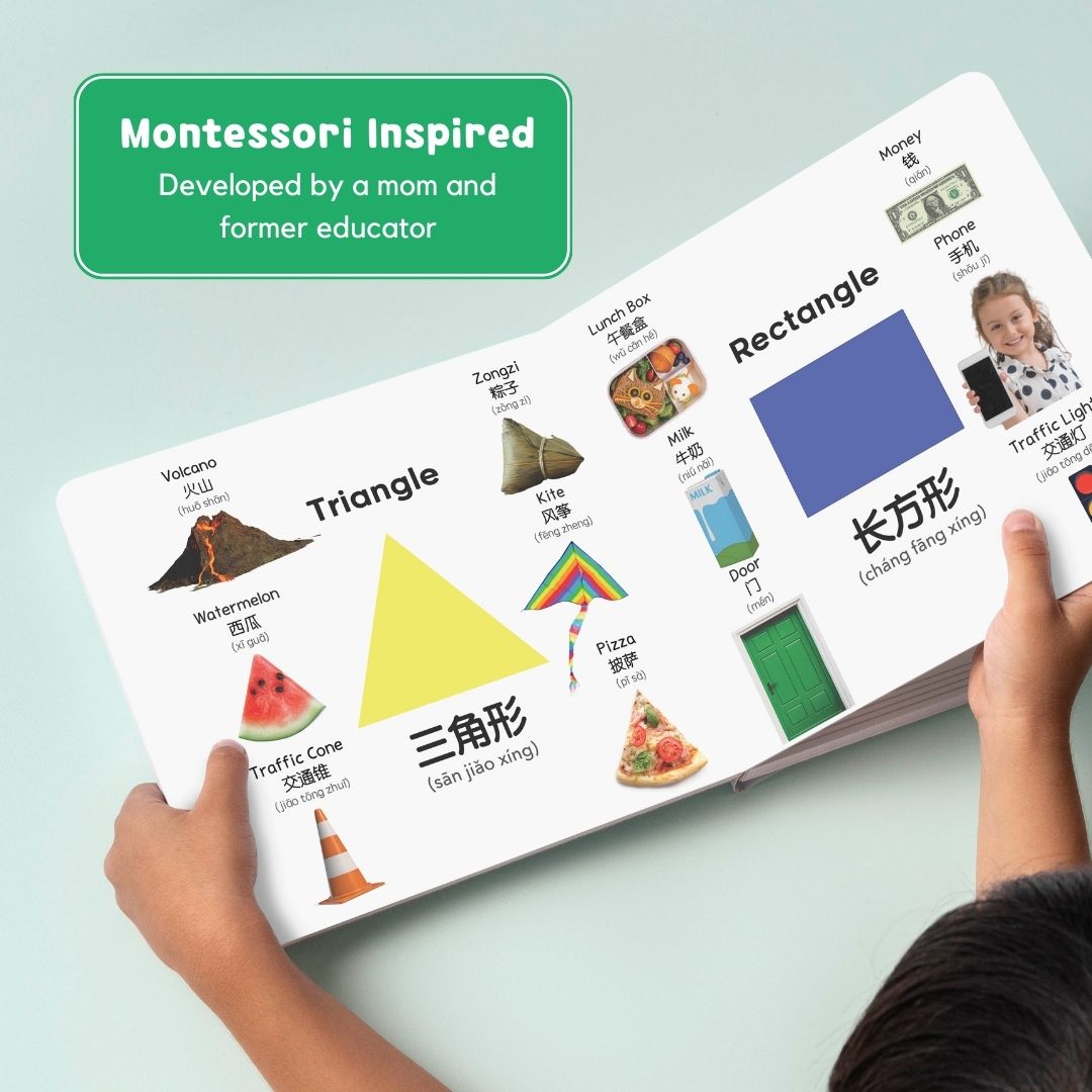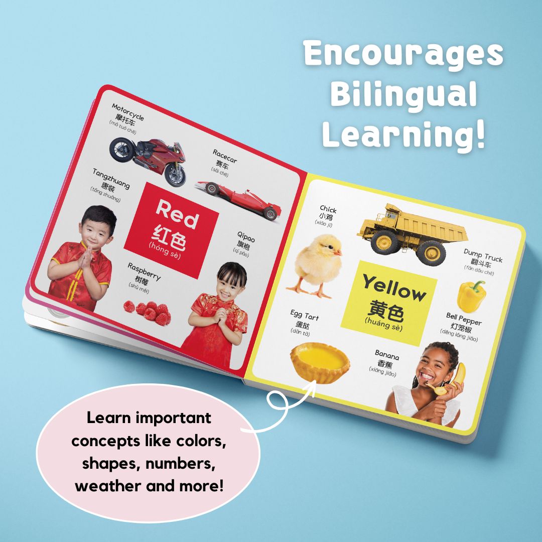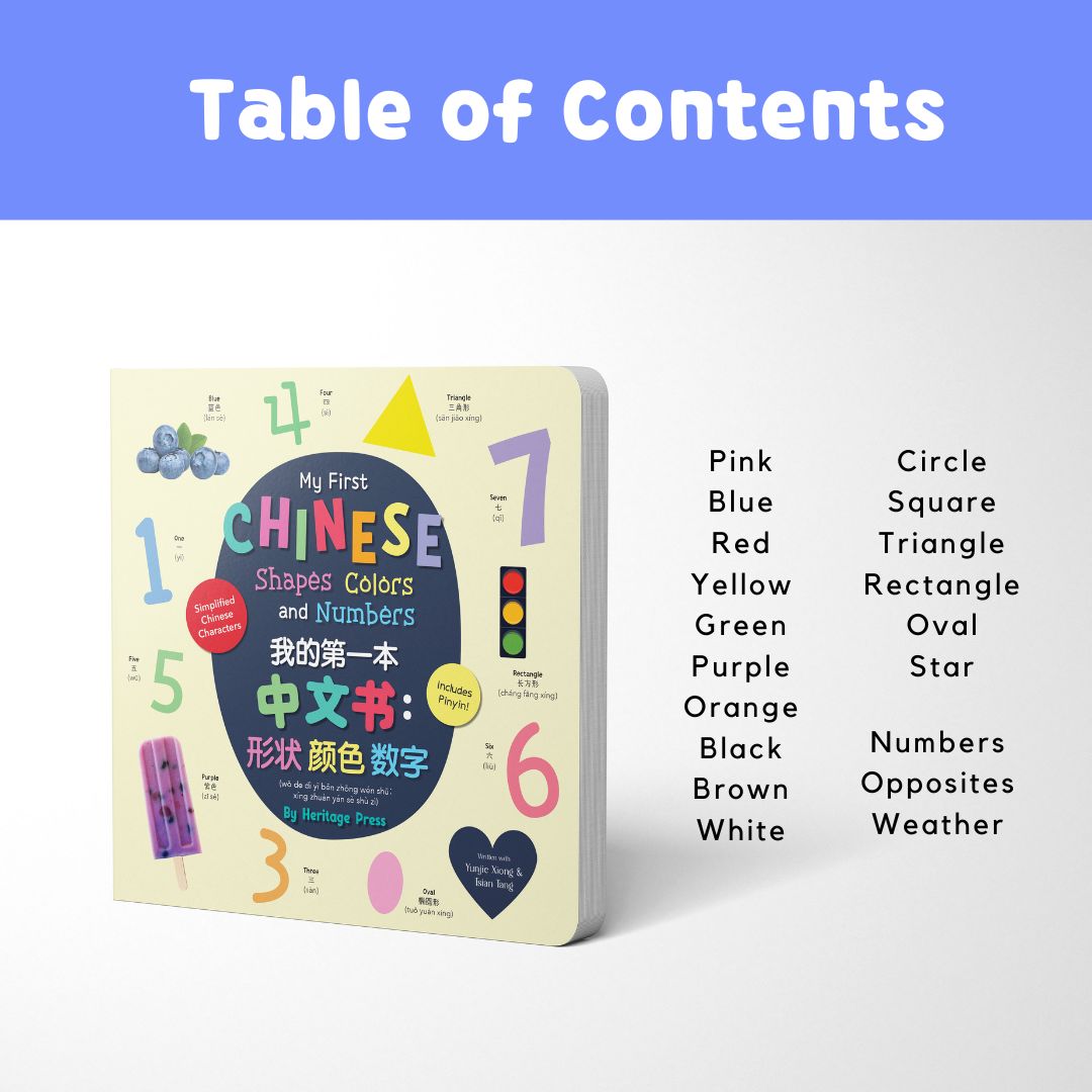 We can help! My First Chinese Shapes, Colors, and Numbers (我的第一本 中文书:形状 顔色 数字) is a bilingual board book written in Simplified Chinese, English, and Pinyin, providing families with a beautiful presentation of key words to share with children.