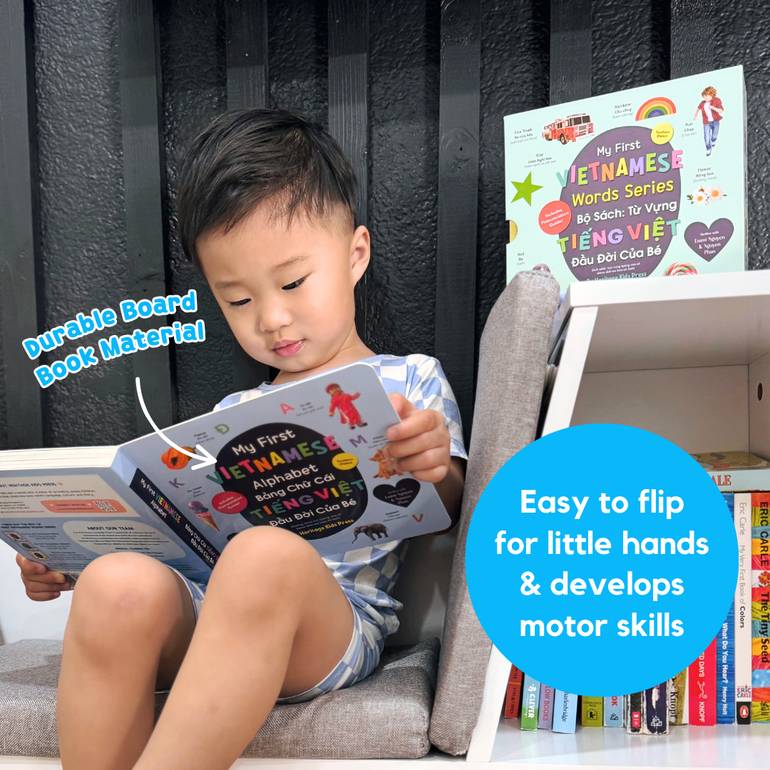 For families searching for Vietnamese books for kids, these books are the perfect tool to learn Vietnamese and introduce elements of Vietnamese culture. Together, the 3 books are like owning a Vietnamese alphabet poster and Vietnamese flashcards in one convenient place. With its wide variety of themes and beautiful presentation of words, the book is especially great for babies, toddlers, preschoolers, and young elementary children.