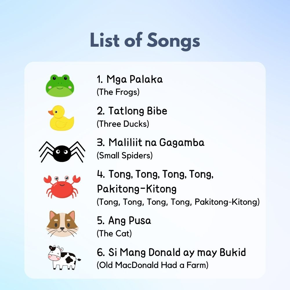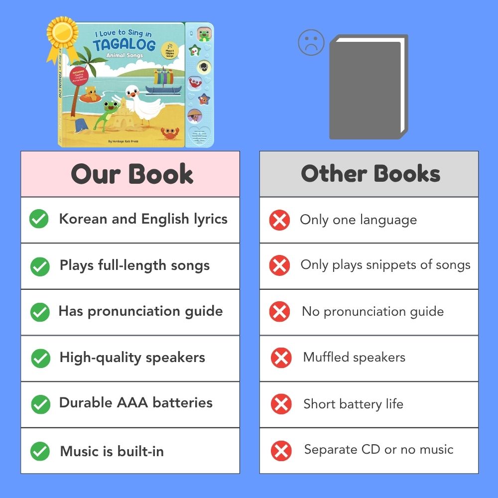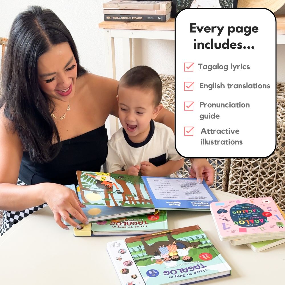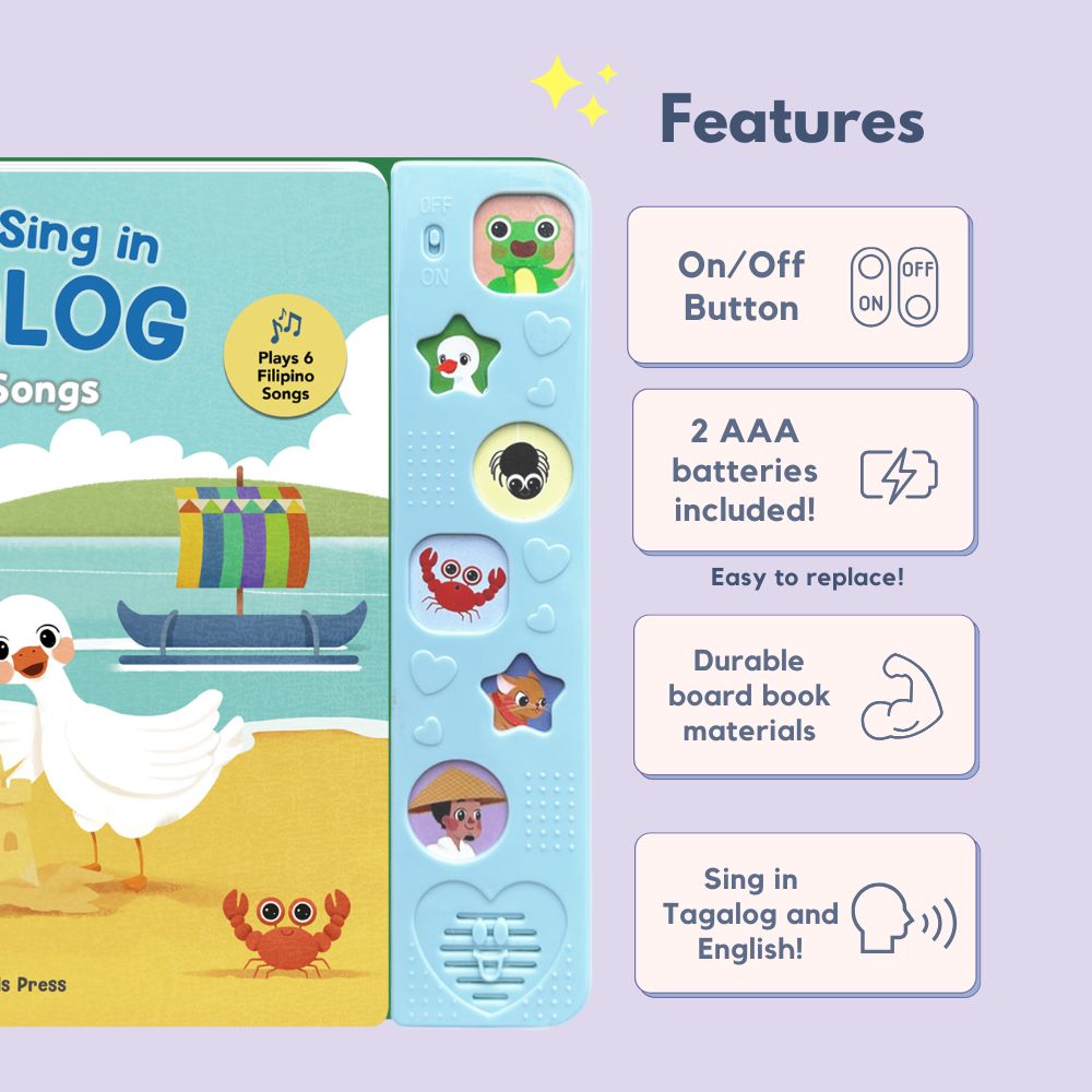 The book includes original lyrics in Tagalog, English translations, and phonetic spelling (romanization) so kids can pronounce each word correctly and confidently. Watch your child’s face light up as they press, play, and sing along!